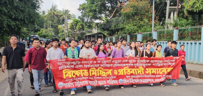 খাগড়াছড়িতে স্কুলছাত্রীকে ধর্ষণের ঘটনার প্রতিবাদ ও দোষীদের গ্রেফতার পূর্বক শাস্তির দাবীতে রাঙামাটি শহরে বিক্ষোভ মিছিল করেছে পাহাড়ী ছাত্র পরিষদ ও হিল উইমেন্স ফেডারেশন।