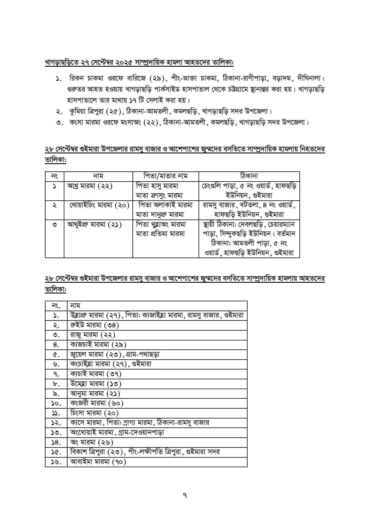 ৩। খাগড়াছড়ি-গুইমারায় সাম্প্রদায়িক হামলায় জড়িত ব্যক্তিদেরকে আইনের আওতায় এনে দৃষ্টান্তমূলক শাস্তি প্রদান করা।