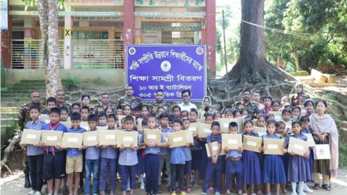 সোমবার(১৩ অক্টোবর ) জীবতলী আর্মি ক্যাম্পের আওতাধীন হরিনছড়া মুখ সরকারি প্রাথমিক বিদ্যালয়ের শিক্ষার্থীদের মধ্যে এই শিক্ষা উপকরণ বিতরণ করা হয়। । মাননীয় সেনাবাহিনী প্রধানের দিক নির্দেশনায় ১০ আর ই ব্যাটালিয়ন অধিনায়ক লে: কর্নেল এ এস এম সাদিক শাহরিয়ার, পিএসসি তত্ত্বাবধানে এই শিক্ষা উপকরণ বিতরণ করা হয় । বিতরণ অনুষ্ঠানে ১১৯ নং ভাইয্যাতলী মৌজার হেডম্যান থোয়াই অং মারমা, স্কুলের প্রধান শিক্ষক ফেরদৌসী আক্তার উপস্থিত ছিলেন।