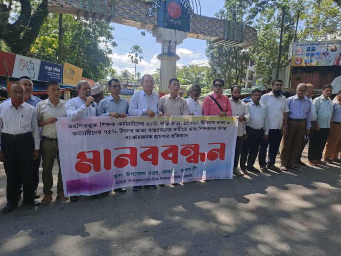 কেন্দ্র ঘোষিত কর্মসূচির অংশ হিসেবে রাঙামাটির কাপ্তাই উপজেলার এমপিওভুক্ত মাধ্যমিক বিদ্যালয়ের শিক্ষকরা নানা দাবিতে কর্মবিরতি ও মানববন্ধন পালন করেছেন।