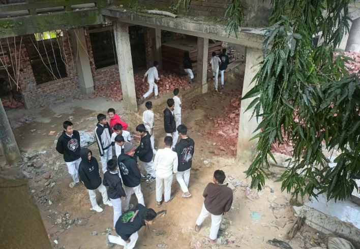 বর্তমানে ভবনের প্রায় ৬০ শতাংশ কাজ সম্পন্ন হলেও নির্মাণ সামগ্রী বিদ্যালয় প্রাঙ্গণে ঝুঁকিপূর্ণভাবে ছড়িয়ে ছিটিয়ে পড়ে রয়েছে।