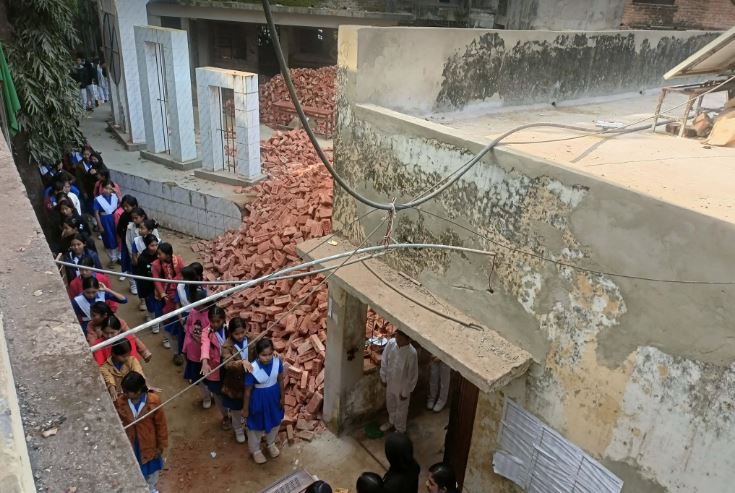 রবিবার (৫ জানুয়ারি) সরেজমিনে গিয়ে দেখা যায়, বিদ্যালয়ের সামনে ভবন নির্মাণসামগ্রীর স্তূপ ঝুঁকিপূর্ণভাবে পড়ে রয়েছে।