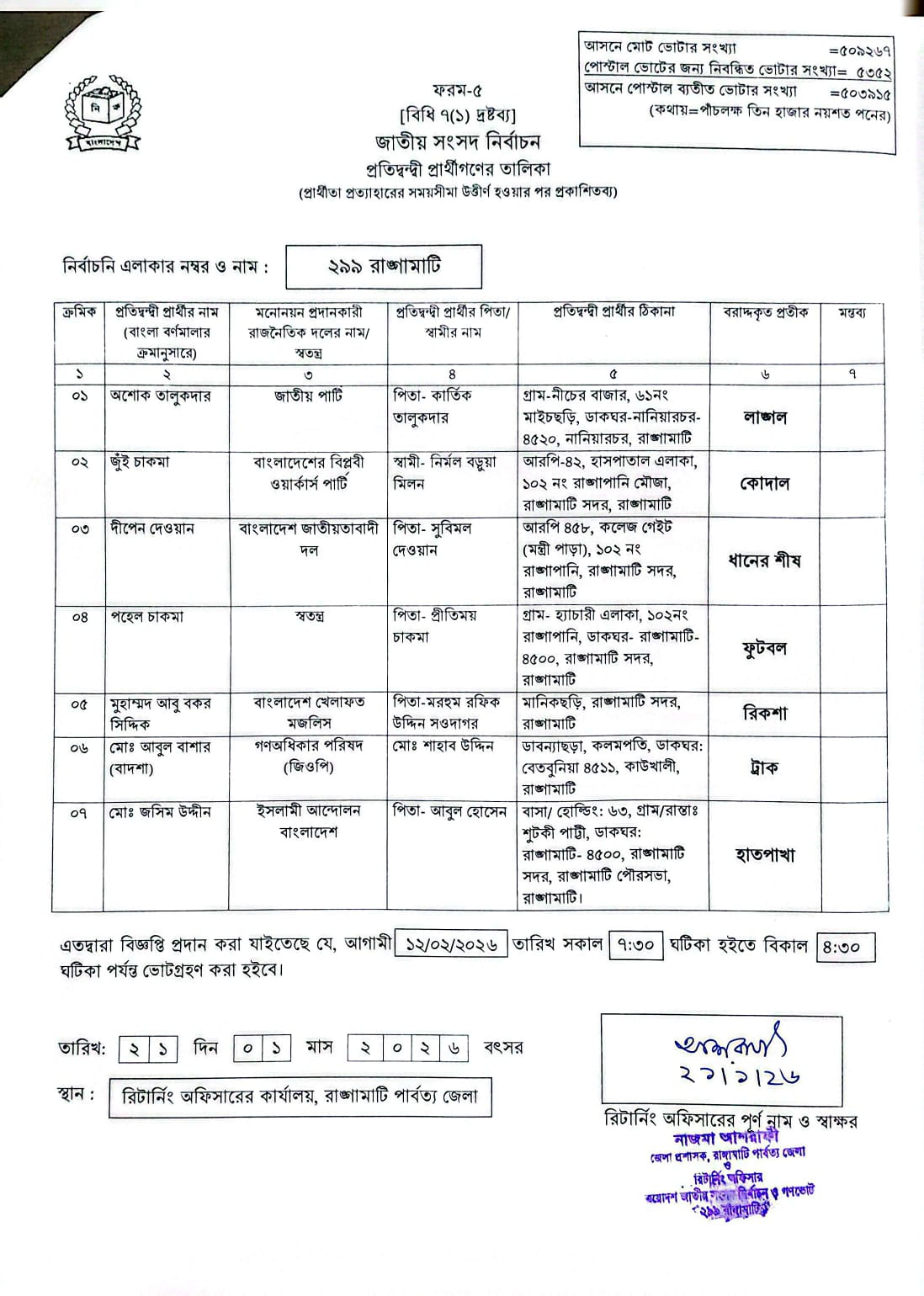 জাতীয় সংসদ নির্বাচনে রাঙামাটি ২৯৯ আসনে ৭ জন প্রার্থীদের মধ্যে প্রতীক বরাদ্দ দেওয়া হয়েছে।