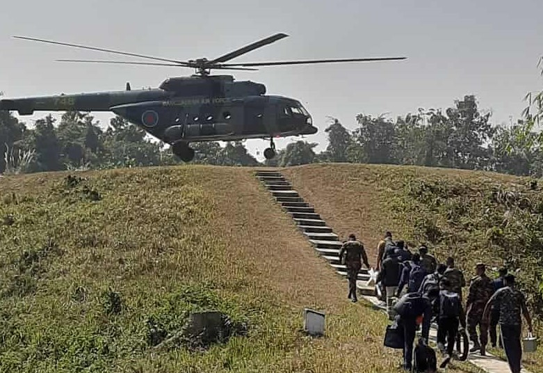 বিলাইছড়ির দুর্গম ৫ কেন্দ্রে কর্মকর্তা-সরঞ্জাম হেলিকপ্টারে করে পৌঁছাল