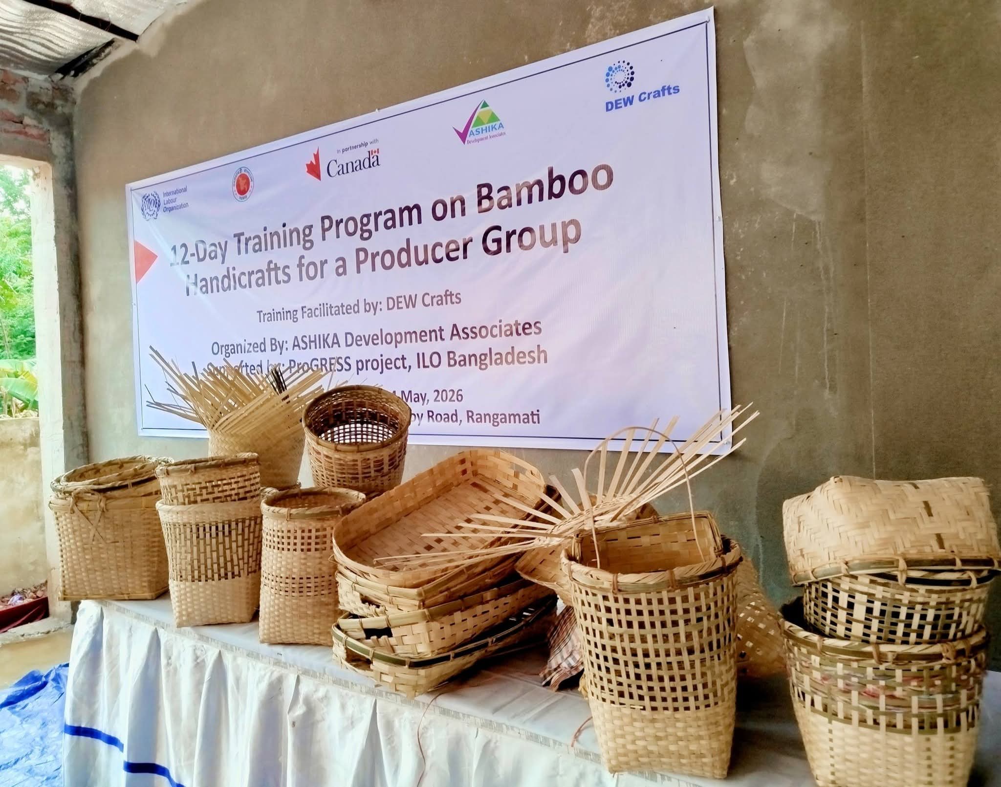 কানাডা সরকারের অর্থায়নে, আর্ন্তজাতিক শ্রম সংস্থার (ILO) অধীনে বাস্তবায়নাধীন প্রোগ্রেস প্রকল্প এর সহযোগিতায় এবং আশিকা ডেভেলাপমেন্ট এসোসিয়েটস এর আয়োজনে ১৫ জন উৎপাদক দলের অংশগ্রহনে ১২ দিনব্যাপী বাঁশ হস্তশিল্প পন্যর উপর প্রশিক্ষনের কার্যক্রম শুরু হয়েছে। ডিউ ক্রাফটস (DEW Crafts)-এর তত্ত্বাবধানে পরিচালিত এ প্রশিক্ষণ কার্যক্রম শনিবার (২৫ এপ্রিল) সকালে রাঙামাটি শহরের কে.কে রায় সড়কে অবস্থিত আশিকা কনভেনশন পার্কে ১২ দিনব্যাপী প্রশিক্ষণ কার্যক্রমের উদ্বোধন করা হয়। উদ্বোধনী অনুষ্ঠানে প্রধান অতিথি এবং উদ্বোধক হিসেবে উপস্থিত ছিলেন বেসিক রাঙ্গামাটি জেলা কার্যালয়ের এজিএম জনাব ইসমাইল হোসেন। অনুষ্ঠানের সভাপতিত্ব করেন আশিকা ডেভেলাপমেন্ট এসোসিয়েটস এর নির্বাহী পরিচালক বিপ্লব চাকমা ।